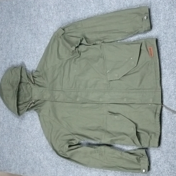 Green Volcom Jacket. Size mens small. 2 front pockets and an arm pocket. Zipper cover. Silver buttons. Leather Volcom patch on bottom. 2 additional pockets on back side. laces to adjust fit.