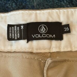 Classic Volcom chino shorts in a warm khaki shade, size 26. These shorts are a coastal cool girl essential — the perfect blend of surfer girl, boho chic, and college-girl casual.