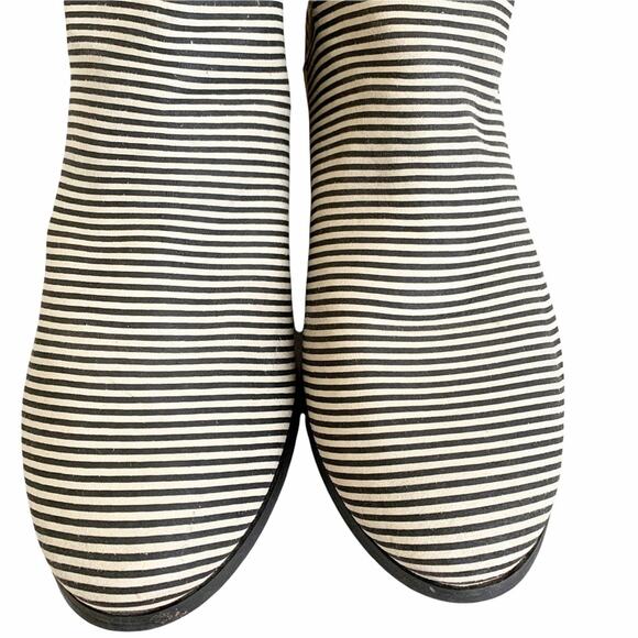 Black and white stripe sueded canvas pull on chelsea boot. Pull tab. Dual elastic side gore. Size 10. Small scratch on toe as shown in pic. Slight marking of dull reddish dye or ink. Cannot really see these minor defects due to the busy stripe print. Otherwise in excellent condition. Retail = $85