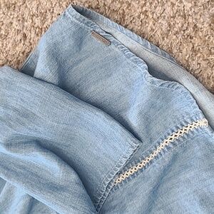 Stylish light blue button down shirt. Features a hood and lace detailing. Perfect for casual wear.