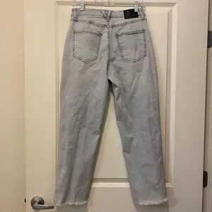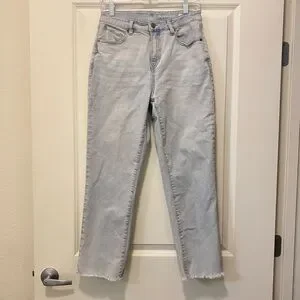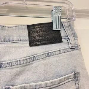 Volcom high-rise women's jeans in a light wash. Straight leg with raw hem detailing. Clean, classic five-pocket style. Versatile casual staple.