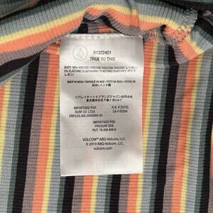 New With Tags Volcom Lil Knit Twist Lived In Lounge Striped Dress Size S Peek-A-Boo Cut Out In the front, 95% viscose, 5% elastane. Coral, Blue, Grey, Yellow Striped, Sleeveless, Elastic Waist.