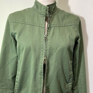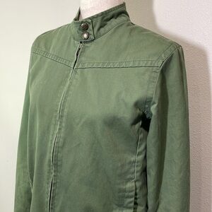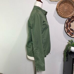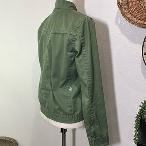 Volcom Lovin' Phoebe army green double zippered bomber jacket with zippers on the cuffs. Great pre-owned condition. There is a run in the fabric on the upper front left side. As seen in pictures.