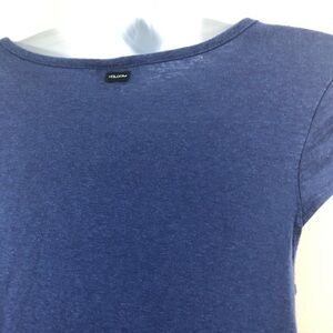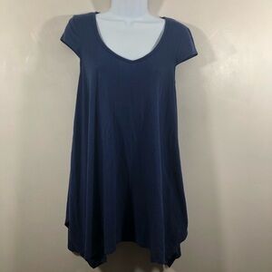 A cute easy relaxed fit tee dress with a rounded v neckline and a raw swingy hemline.