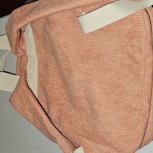 Volcom BN mini backpack in pink corduroy with cream accents/straps. one exterior pocket, interior protected pouch for tablet etc