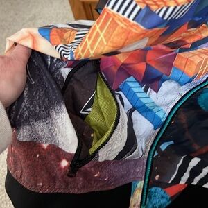 Bold graphic design with vibrant colors. Features a mix of abstract patterns and geometric shapes. Perfect for a standout look.
