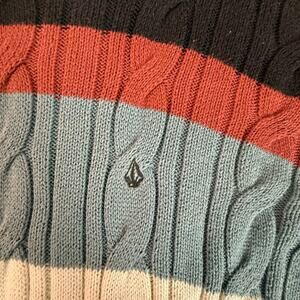 Cozy Volcom cable knit sweater in bold multicolor stripes. Soft knit with classic crew neck, long sleeves, and subtle logo embroidery on front. Preowned and well kept, minimal signs of wear. Please examine photos for details. Perfect transitional layer or statement sweater for fall/winter.