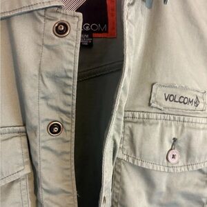 In excellent condition! Really cool lightweight snap front military inspired jacket top from Volcom. Cropped with unfinished edge. Lots of stitching and patch details.