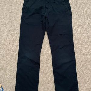 Flat front navy blue pants.