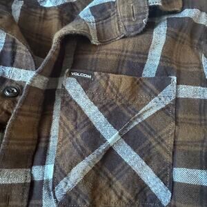 Volcom button-down plaid flannel in a stylish brown and gray plaid pattern.