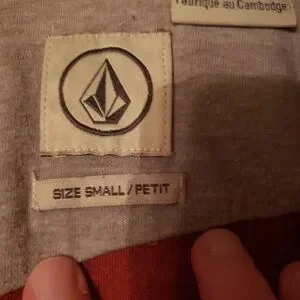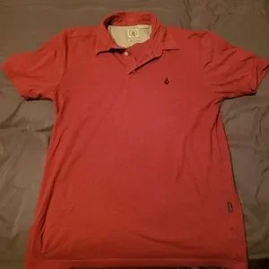 Volcom polo is a men's size small. Polo is a burgundy red with Volcom stone on left side of chest, Volcom tag on bottom left side, Volcom stone outline on right side and Volcom tag on back. Previously worn good condition. Perfect to wear in a business casual setting, hanging out with friends, school uniform or on a casual day.