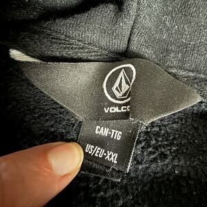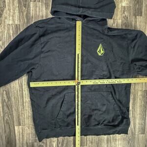 Black Volcom pullover hoodie featuring the iconic Stone logo on chest and sleeve. Soft fleece interior, roomy hood, ribbed cuffs and hem. Clean seams, good structure, great everyday skate or streetwear piece. No missing parts, no damage visible.