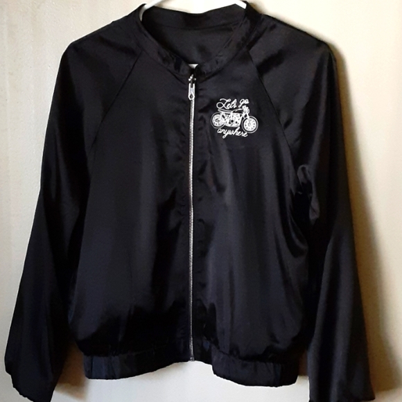 Cute reversible Volcom womens jacket. Fabric is satin. On one side there is a pic of a motorcycle. When you reverse the jacket it has a pic of a sun. As shown on pictures above. This jacket is so cute and light.