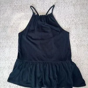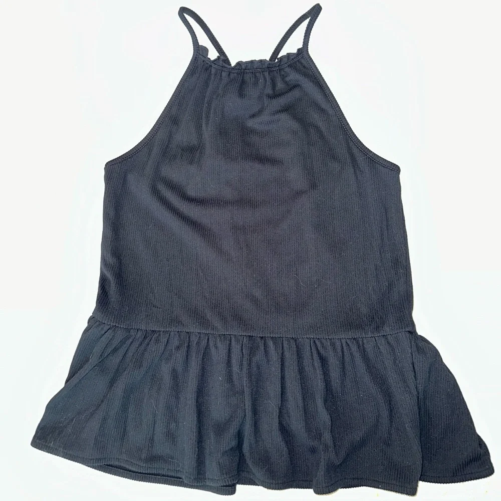 Featuring a high neck, racer back, ruffle at front neck opening and branded with metal plate at back of neck.