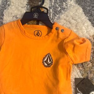 Vibrant orange Volcom tee with logo detail. Paired with light gray shorts. Perfect casual wear.