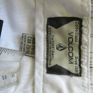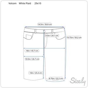This is a super handsome pair of Volcom youth shorts. White cotton blend with black and tan plaid, embroidered logo, slash pockets and asymmetrical back yoke.