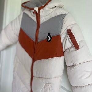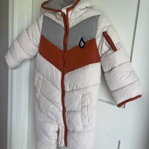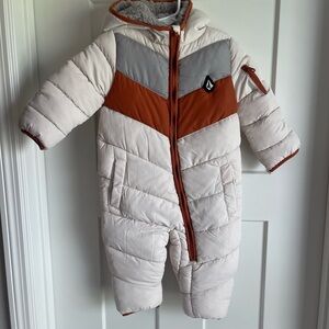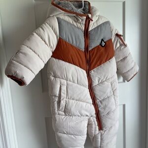 Cozy puffer snowsuit with hood. Features zip closure and arm pocket. Ideal for winter fun.