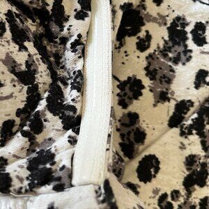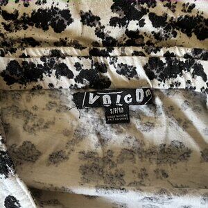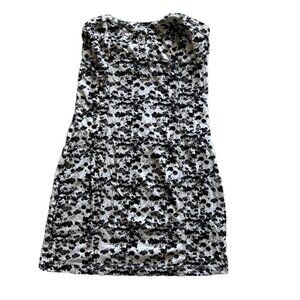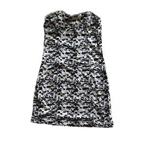 In excellent, clean condition. Strapless mini dress from Volcom. Jersey knit fabric has a black and white abstract print. Has no slip band at top to keep dress in place. Form fitting body-con style. Size small. Dress measures 26 inches from top to bottom.