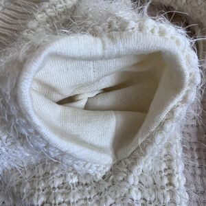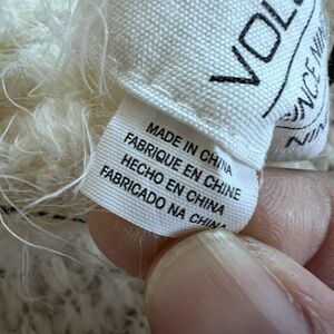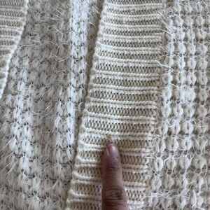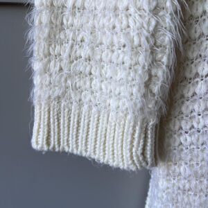 Material: Body 80% acrylic, 20% polyamide (per tag); soft fuzzy eyelash knit with ribbed shawl collar, cuffs, and hem.