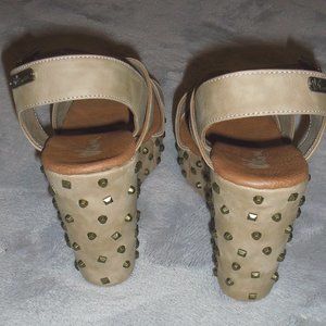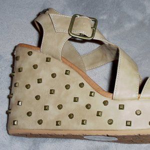 Volcom Tan Studded Wedge platform Sandals Women's 8 BRAND NEW. "Aim High" tan with bronze studs wedge platform sandals by Volcom. Women's size 8 Medium. Front platform is 1.5" tall; heel is 4.5" tall. BRAND NEW - NEVER WORN. My old knees can't wear them.