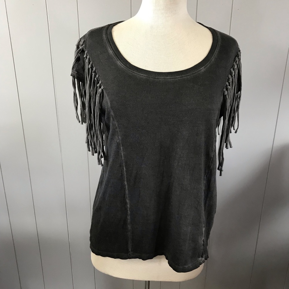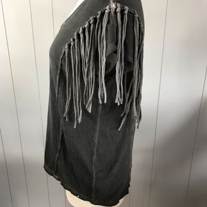 Cute distressed dark gray tee shirt with fringe detail. Size XS