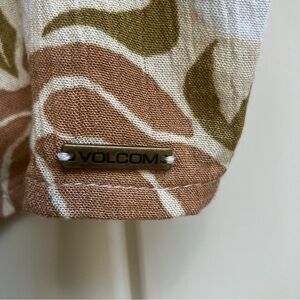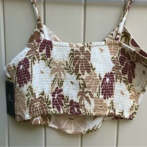 This is a NWT Volcom women's cropped strappy halter top in a tropical red, beige, cream, and green print. Size XS. Smocked back, metal front detail, adjustable straps. Surfwear, resortwear, beach, summer, party, festival, surfer girl, BBQ