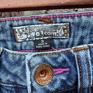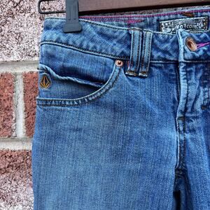 Light to medium wash boot cut Volcom jeans. In good used condition. Signs of wear on knees.