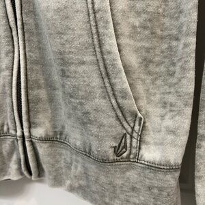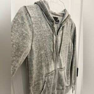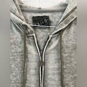 Casual and cozy zip-up sweater. Features a hood and front pockets. Green-grey color. Women’s size Small.