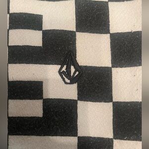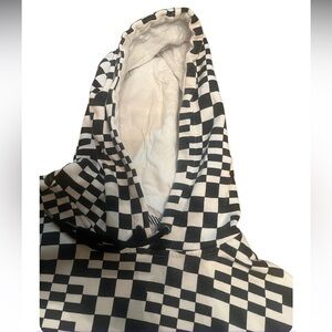 Volcom black and white plaid pullover skater hoodie, size Medium. This hoodie has 2 side pockets and a drawstring at the neck. There are no holes, rips or stains.