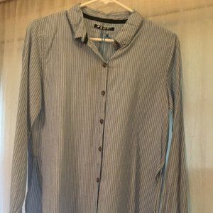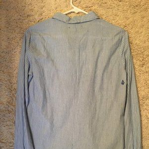 Long sleeve Collared Blue and white striped Volcom button down shirt.