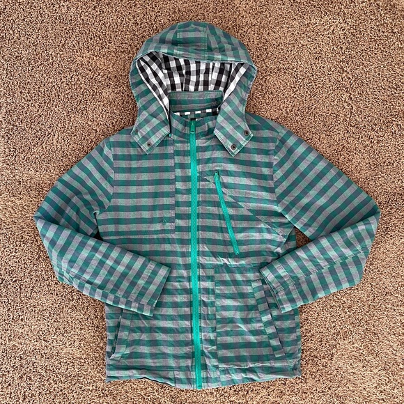 Full zip, removable hood, zippered chest pocket and a small interior pocket.
