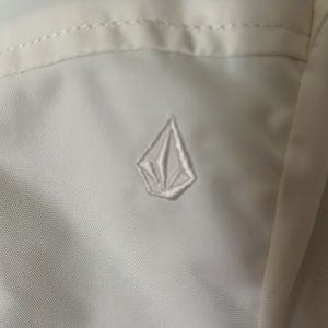 Volcom's off white “Enemy Lines” lightweight, hooded windbreaker with drawstrings, polyester, Zip-front closure, Flap pockets at chest and hips