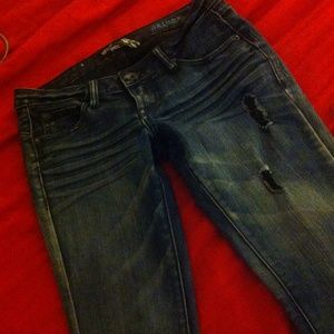 Volcom skinny jeans dark blue with some ripped detail in the front legs. Size 3 but run small. Inseam 32in.