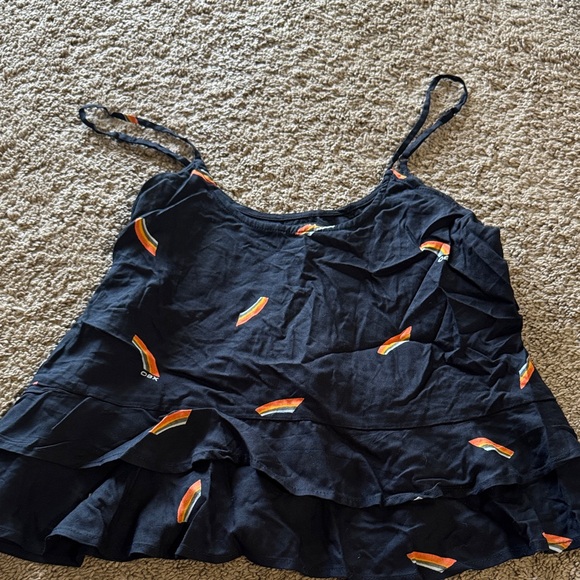 Stylish black tank top featuring vibrant orange and red accents. Perfect for casual wear.