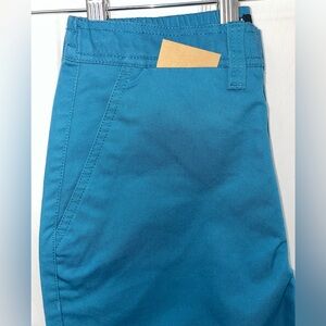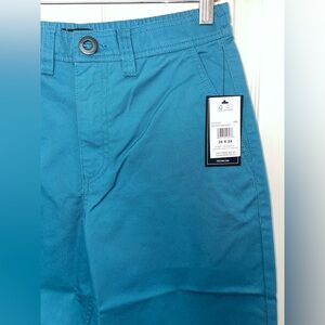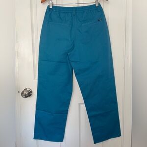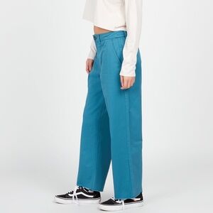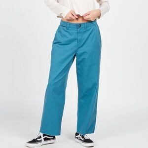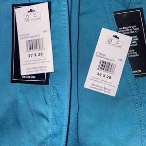 “Harbor Blue” Volcom Women’s ThisThatThem Skate pants. Moderately high rise. Relaxed fit. Raw edge bottom. Fixed front with chino buckle button and elasticated back waistband. Deep, side entry pockets and Wax Pocket under waistband in front. Welt pockets at back. Sizes 26X28 and 27X28 available. Made of 60% Cotton, 40% Polyester. Both new with tags.