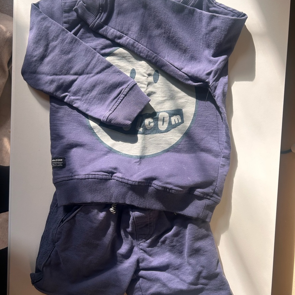 Blue sweat set, crew neck with shorts. Pockets in front and back. Volcom branding visible - NEVER WORN! Remnants of tags, washed but my son did not wear