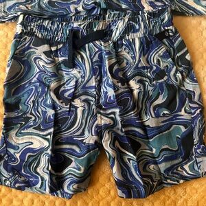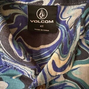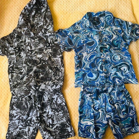 Up for sale are 2 size 4t Volcom sets worn once in like new condition. One set has an islander vibe with a short sleeve hoodie and a large front pocket, 2 deep side pockets on the shorts and a single pocket in back and the other is a button up short sleeve with a single front pocket and 2 deep front pockets on the shorts and a single pocket in the back with a marbled swirl pattern.