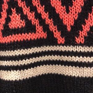 Knit and comfortable. Tiny paint stain on right sleeve (shown in photo)