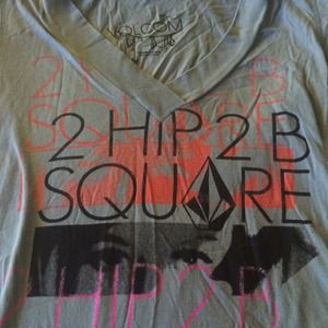 Gray v-neck, black, neon pink and neon orange design that says "2 Hip 2 B Square" the "a" in "Square" is the Volcom symbol.