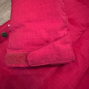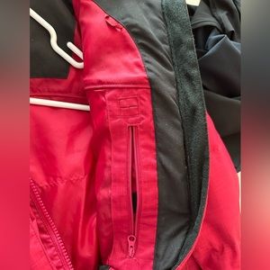 Red berry color. Size small. Long/ slim fit. Fux fur hood. Zip, button and Velcro closure. Two outer front pockets and an outer arm zip pocket. Two inside pockets one for phone and head phone cord. Ventilation zips on both underarms. Snap powder skirt. I only wore this jacket a few times due to living in socal, so it’s in great condition. A little discoloration by the opening of the sleeves, but that should easily come off which I will try and update the post. See pics for reference. 8k waterproof. Good warmth. I would wear for more winter skiing than spring skiing.
