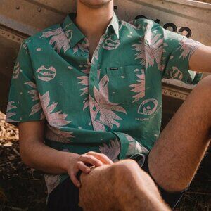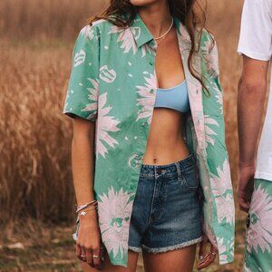 Volcom x OBX Wintergreen Your BF’s Shirt. Was first released as the Mag Sketch Shirt, then as the Your BF’s Shirt in collaboration with Outer Banks. This is the collab version. The pockets are a slightly different shape. The Mag Sketch version was seen on John B in season 1 episode 3, then on Sarah Cameron in season 2 episode 4.