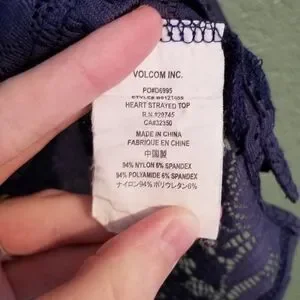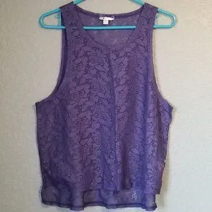This is a periwinkle, rose designed lace, Volcom high-low tank top with slits on either side at the bottom of the top. This top measures 19.75 inches from armpit to armpit and 22.75 inches from shoulder to hem. This top is preloved with no flaws.