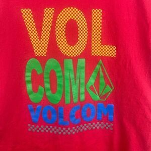 Volcom Red Logo T-Shirt sz XL. Features bright red 100% cotton jersey with yellow, green & blue logo graphic. Gently worn and laundered with very light wash wear and a tiny tag hole near the shoulder seam (see pic). The colors are so vibrant on this one - perfect for summer!