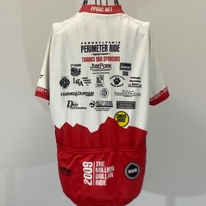 Voler cycling jersey, perfect for the cycling enthusiast or collector of unique athletic apparel. This jersey commemorates the 2009 Pennsylvania Perimeter Ride Against Cancer, featuring bold graphics related to the event on the front and back. The design incorporates a white, red, and black color scheme with cycling silhouettes and various sponsor logos. Ideal for casual bike rides, charity cycling events, or as a statement piece in your athletic wardrobe.