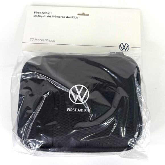 Genuine Volkswagen OEM first aid kit designed for factory vehicle storage compartments, providing essential emergency supplies in a compact, durable case. Ideal for keeping in your VW trunk, cargo area, or glove compartment for peace of mind on the road.