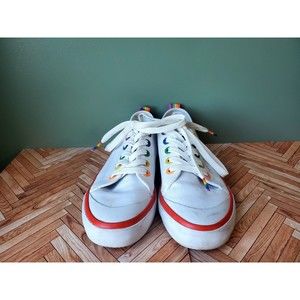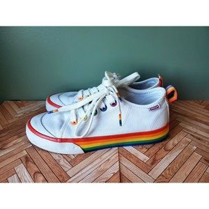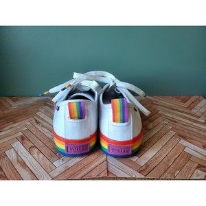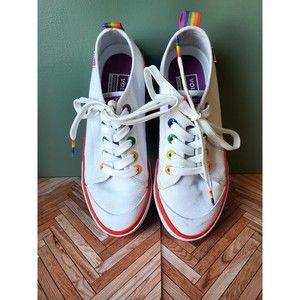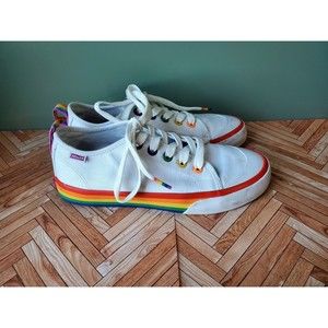 This is a pair of Volley brand Pride Deuce Low Sneakers. Rainbow design and Canvas upper. Colored eyelets and lace tips. Unisex: Mens Size 7 & Womens Size 9.
