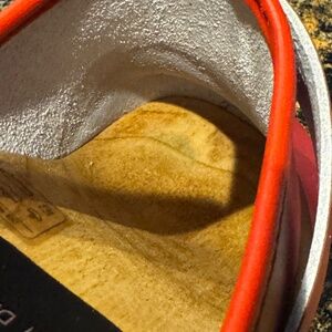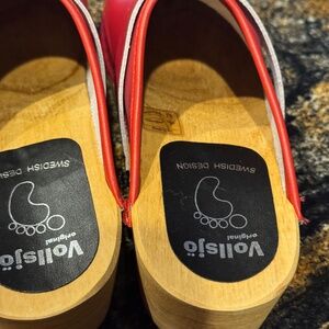 Wooden and red leather new clogs never worn. Please look at all photos and see inside as you will see wood grading that looks like foot shape. This is NOT foot wear but grading from wood pattern. These are easy slip on shoes and fun for all season. Euro size 38 American 8 but I will say snug 8.
