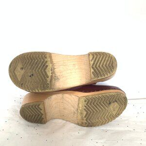 Really adorable pair of Vollsjo Swedish clogs with wooden heels in a gorgeous burgundy wine color with laser cut details. It is very bohemian and has the ankle strap with Mary Janes being very on trend lately. Heel is 1.75" with .5" platform and the sole has a nice tread. Perfect for jeans or skirts and dresses. Preowned condition with some light cracking in leather in a few places and dirt to insoles. Just didn't have time to clean them up.