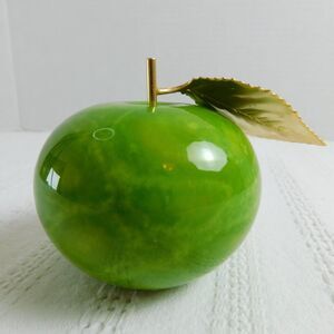 Genuine Volterra Alabaster Hand Carved Green Apple with Gold Leaf, by Ducceschi, Made in Italy. Beautiful Polished Finish. Excellent Condition.