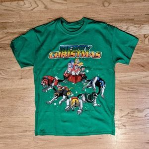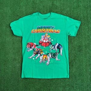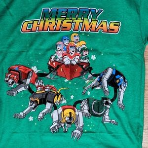 Retro holiday green Voltron characters with 5 Lions Chest graphic and MERRY CHRISTMAS screenprinted across the chest.